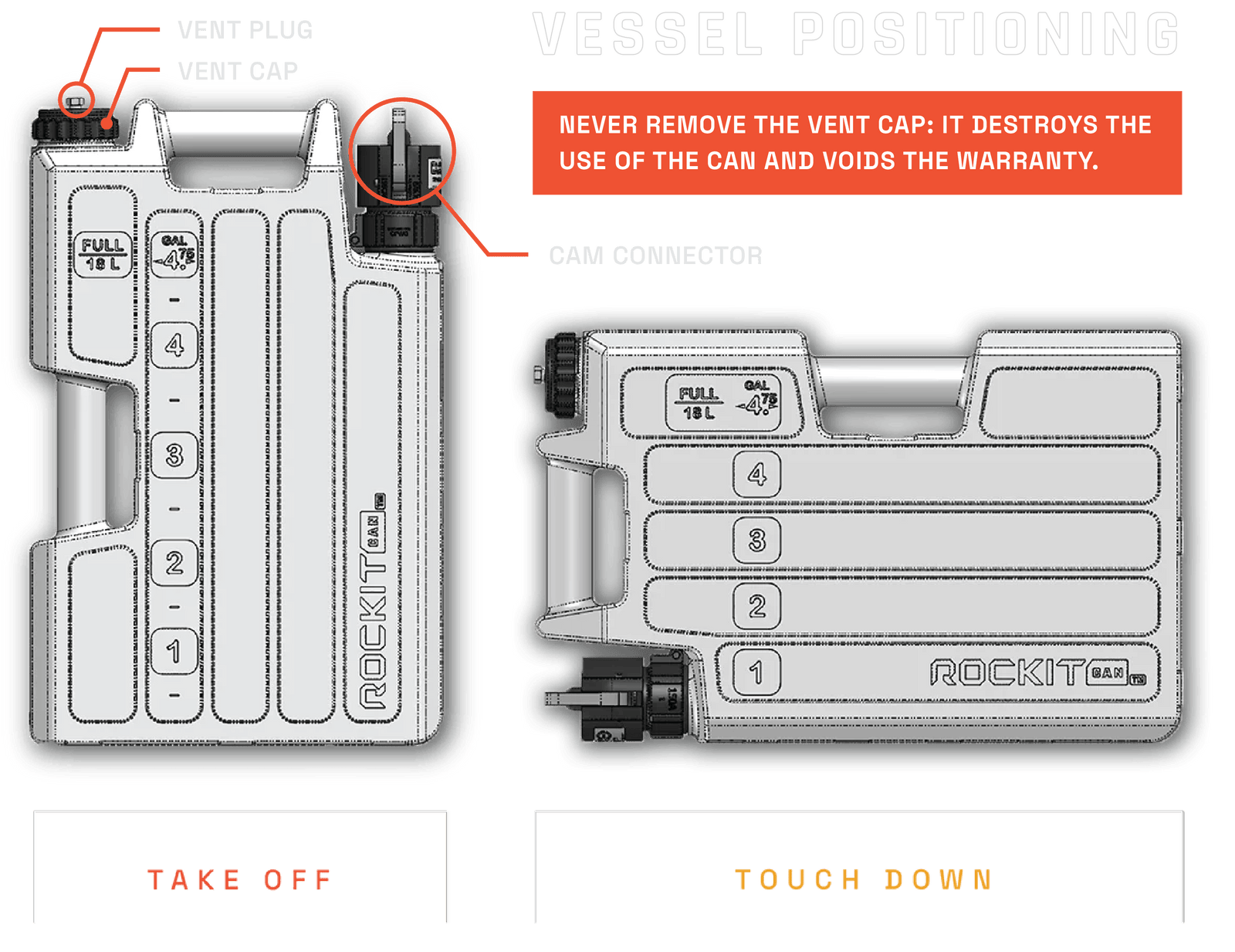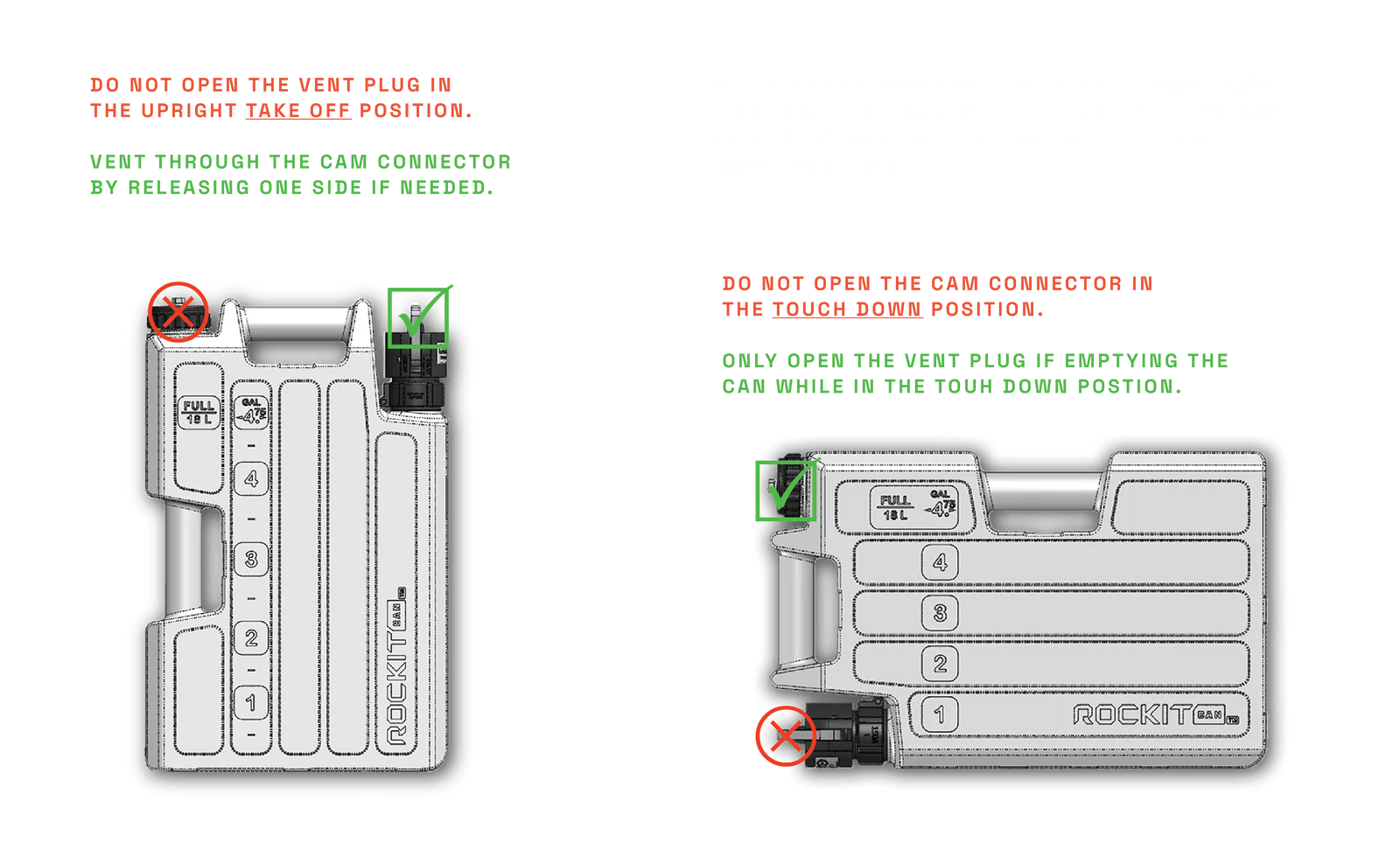 WARNING: Opening the vent plug in the TAKE OFF position can lead to significant spills!VENTING VIA CAM ADAPTER Relieving internal pressure can be achieved in the upright TAKE OFF position by releasing one arm of the CAM dust cover or connector, depressing the trigger of a nozzle attachment as long as nozzle is positioned higher than the canister.